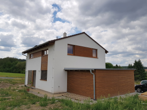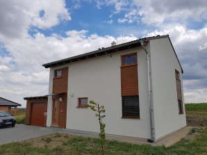 Chtěli by jste v přízemí domu Kubis 74 pracovnu nebo hostovský pokoj? Na fotkách z této realizace uvidíte, že i s touto úpravou budete mít prostornou kuchyň s jídelnou a obývacím pokojem. Také uvidíte jak to vypadá, když se v koupelně v podkroví vytvoří samostatné WC. Všimněte si i hnědé střechy, vnitřní folie na rámech oken, venkovních žaluzií, hnědé stříšky nad vchodem a stylové poštovní schránky...