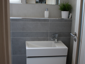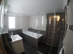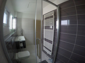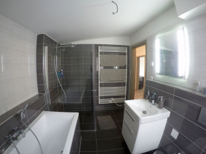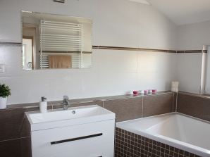 - sanitární vybavení - umyvadlo ze sanitární keramiky v bílé barvě se směšovací pákovou baterií, umývátko ze sanitární keramiky v bílé barvě se směšovací pákovou baterií, vana s pákovou baterií a se sprchovou hadicí a růžicí, sprchový kout včetně baterie se sprchovou hadicí a růžicí a kombinované WC