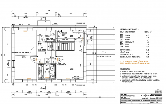 | Obývací pokoj 21,34 m2 | Šatna 4,75 m2 | Zastavěná plocha 64,609 m2 |