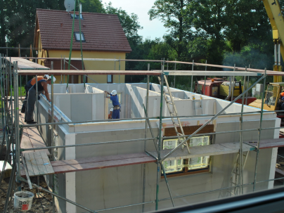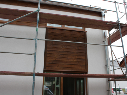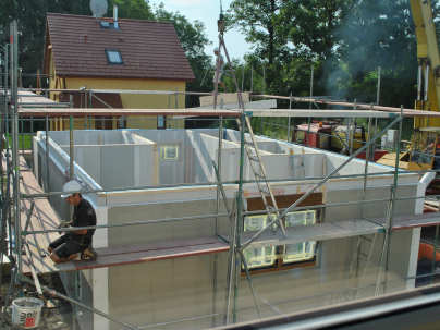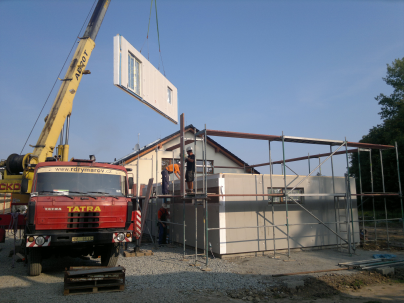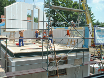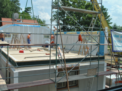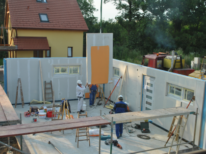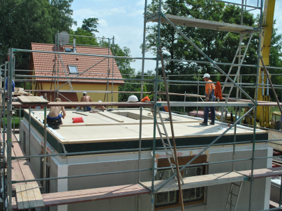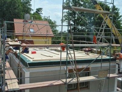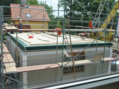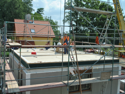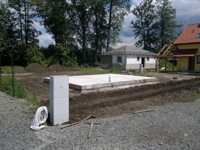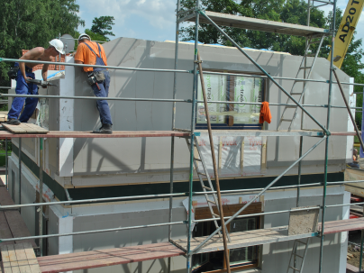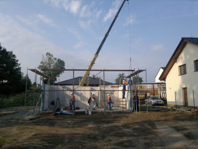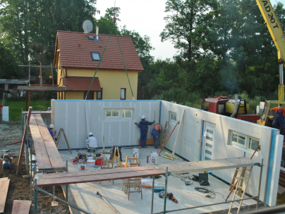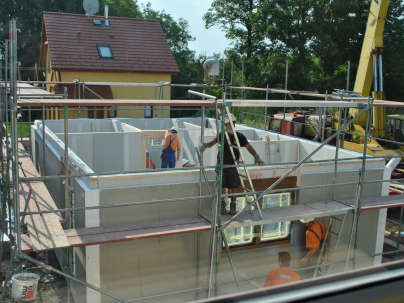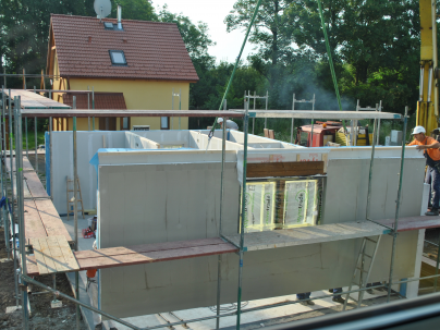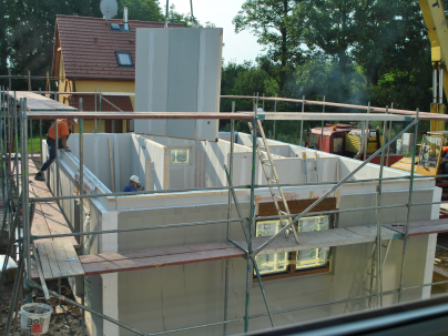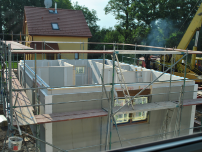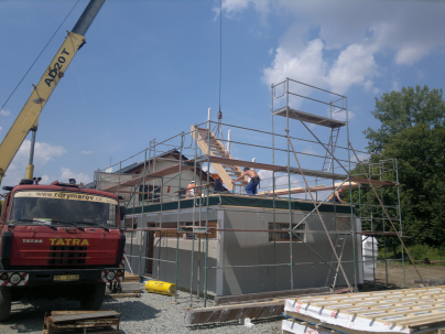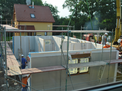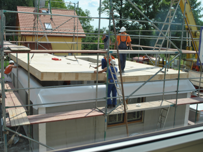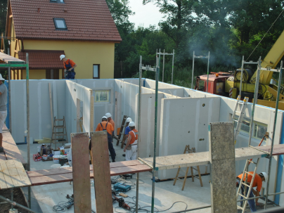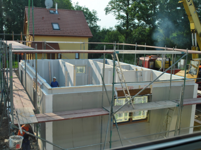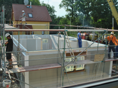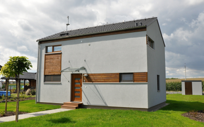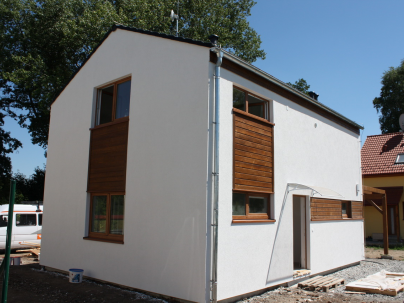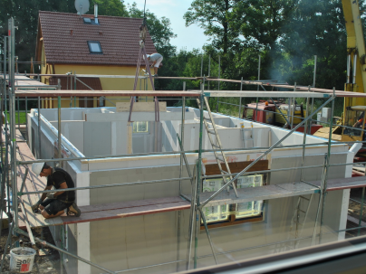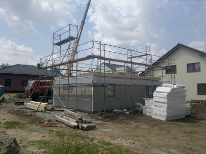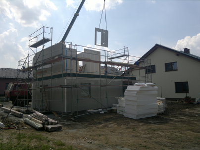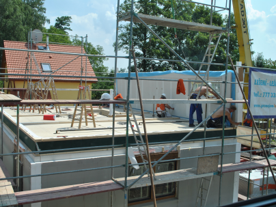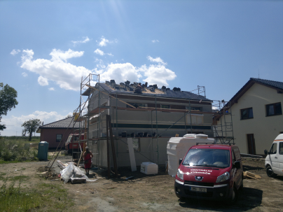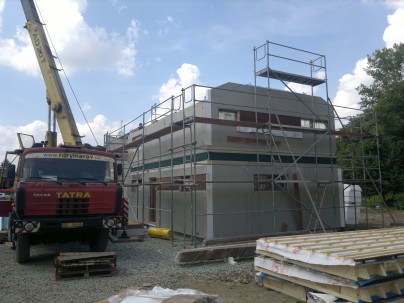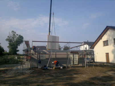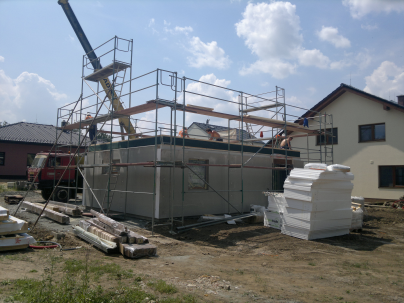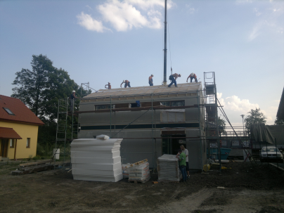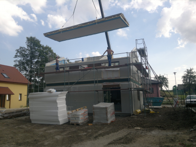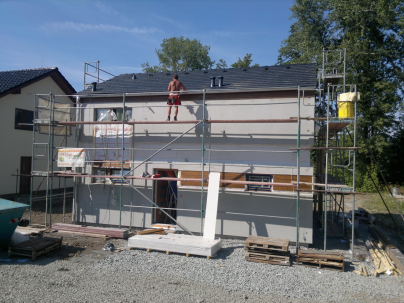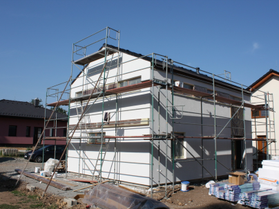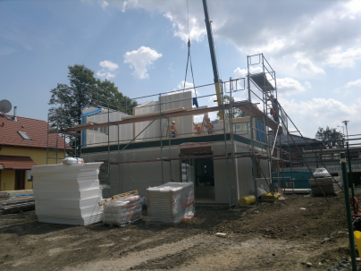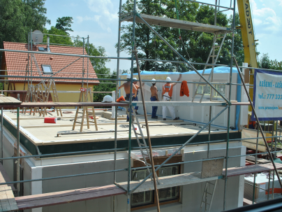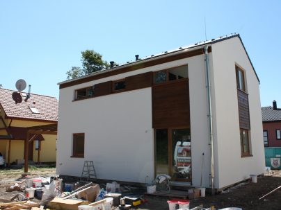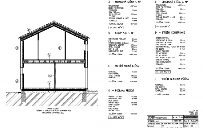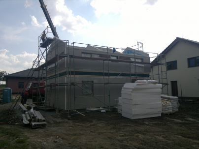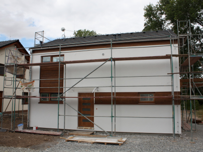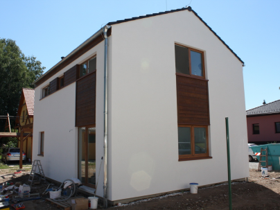 - obvodové stěny s vnitřní izolací 120 + 40 mm a vnější termofasádou 150 mm uzavřenou strukturní barevnou omítkou