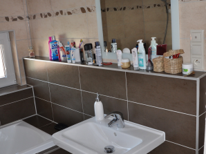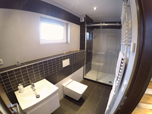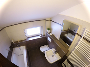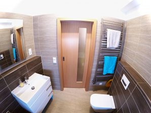 - sanitární vybavení - umyvadlo ze sanitární keramiky v bílé barvě se směšovací pákovou baterií, umývátko ze sanitární keramiky v bílé barvě se směšovací pákovou baterií, vana s pákovou baterií a se sprchovou hadicí a růžicí, sprchový kout včetně baterie se sprchovou hadicí a růžicí a kombinované WC