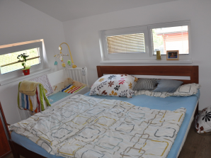 Tento dům je zvětšovaný o jeden modul (60cm šířky - asi 7,5m2 plochy domu navíc), kuchyň má přesunutou do prostoru pracovny, kde byla zrušena příčka do chodby. Pod schodištěm je komora. Zádveří domu je zvětšené o 70cm. Spodní koupelna je s velkým sprchovým koutem, bojler je přesunutý do komory v patře, pračka je zabudovaná v kuchyňské lince. V patře je rozdělený dětský pokoj na dva samostatné pokoje, jsou zde přidávaná okna šířky 90cm na štítovou stěnu. V ložnici je nad schodištěm prostor na vestavnou skříň, prozatím bez polic a dveří. V koupelně v patře je vana přesunuta pod okno. U domu je místo pergoly garáž standardní velikosti.