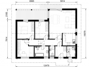 Bungalov Bungalov 90 má prakticky řešený půdorys, který přímo vybízí k vybudování terasy přístupné z domu. Dům Vás potěší absencí schodiště a dostatečně velkým prostorem k bydlení.