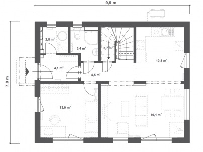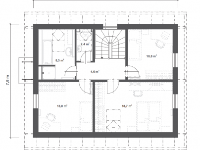 Díky zvýšené obvodové stěně v patře na 1,3 metru nabízí tento dům dostatek prostoru i v podkroví.