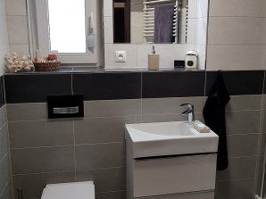 - sanitární vybavení - umyvadlo ze sanitární keramiky v bílé barvě se směšovací pákovou baterií, umývátko ze sanitární keramiky v bílé barvě se směšovací pákovou baterií, vana s pákovou baterií a se sprchovou hadicí a růžicí, sprchový kout včetně baterie se sprchovou hadicí a růžicí a kombinované WC